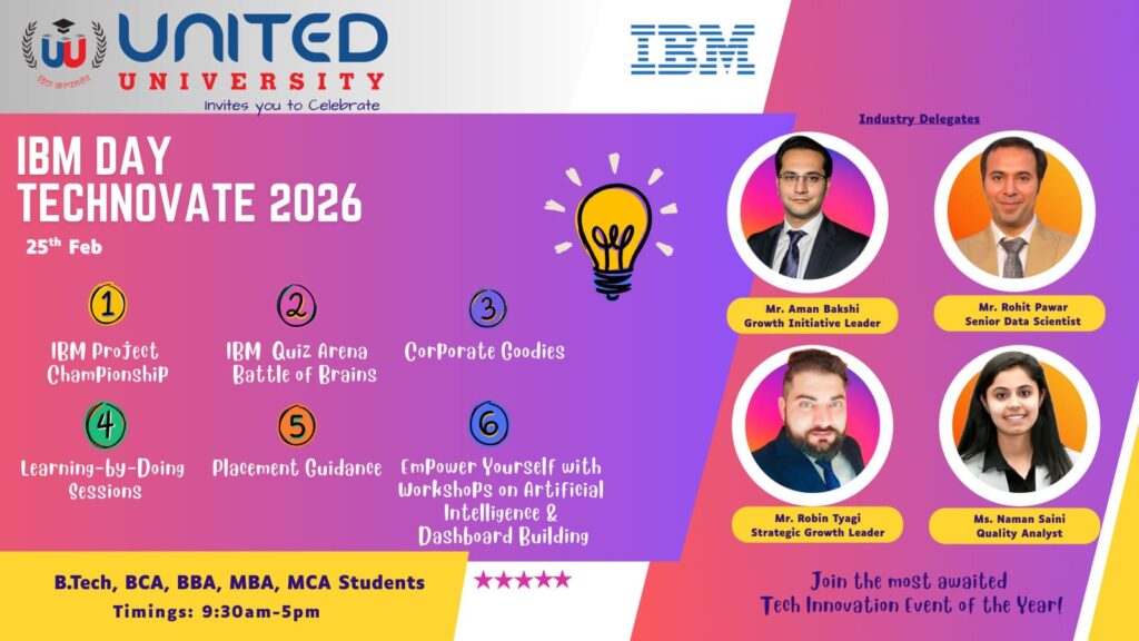 Prayagraj witnessed a remarkable convergence of innovation, technology, and young talent as United University hosted “IBM Day – Technovate 2026” on 25th February 2026. The one-day mega event was carefully designed to empower students with practical exposure to Generative AI, dashboard building, industry insights, and project-based learning, making it one of the most impactful academic-tech collaborations on campus this year.